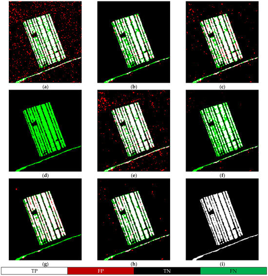 Results for the Village of Feltwell dataset. (a) PCAKM; (b) Bayesian; (c) GaborTLC; (d) LMT; (e) NRCR; (f) AGLRTM; (g) INPCANet; (h) proposed; (i) reference. In the binary change map, the following apply: white TPs; red, FPs; black, TNs; and green, FNs.