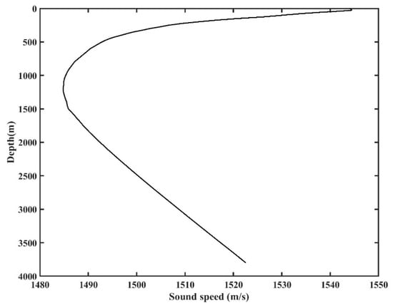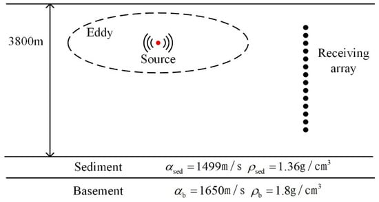 In numerical analysis, the simulation parameters are chosen based on an experiment conducted in the China Sea. The measured SSP serves as the background field without the influence of an eddy, as illustrated in Figure 1. Figure 2 shows the distribution of sound speed induced by a warm ( = 10 m/s) and cold ( = −10 m/s) eddy within the depth of 500 m. In these simulations, only the eddy intensity is varied, while all other parameters remain the same. The eddy center () is positioned at a distance of 0 km, with a depth () of 150 m, a horizontal radius () of 60 km, and a vertical radius () of 100 m, which is a subsurface eddy. The maximum sound speed perturbations in cold and warm eddy environments are 10 m/s and −10 m/s. The simulation configuration is shown in Figure 3, where the seabed remains constant at a depth of 3800 m. Based on sediment sampling results in the China Sea [], a two-layer seabed model is employed. The model comprises a sediment layer with a thickness of 20 m, a sound speed of 1499 m/s, and a density of 1.36 g/cm3. The homogeneous half-space basement has a sound speed of 1650 m/s and a density of 1.8 g/cm3. The attenuation coefficients for both layers are set to 0.068 . The sound source is positioned at the horizontal center of the eddy, with a depth of 250 m and a center frequency of 150 Hz. The signals are generated by the sound field calculation model. To meet the narrowband condition essential for subsequent array gain analysis, only acoustic signals within a frequency range of 145–155 Hz are selected for examination, with a frequency interval of 0.1 Hz and a duration of 10 s.