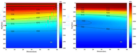 Distribution of sound speed for the environments with an eddy within the depth of 500 m; (a) a warm eddy ( = 10 m/s), (b) a cold eddy ( = −10 m/s). The red dot respects the sound source.