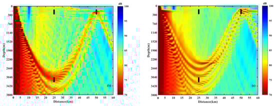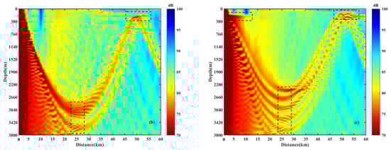 Figure 4 shows TL in the range of 60 km with or without an eddy. It can be seen that the environment without an eddy exhibits typical deep-sea sound propagation characteristics, with the propagation distance spanning a complete CZ. Notably, there are striation patterns in the direct sound region, corresponding to four interference beams. By comparing TL in the no-eddy environment with the results under different eddy conditions, it can be observed that: (1) Near the first CZ, the upper turning points are deeper, and the sound energy is more concentrated, influenced by the warm eddy in Figure 4b. Conversely, the cold eddy, as shown in Figure 4c, leads to shallower upper turning points and divergent sound energy. (2) In the ranges of 0~10 km and 50~60 km of Figure 4c, the existence of a cold eddy near the source depth induces the formation of an eddy waveguide with deeper depth and lower sound speed, similar to the classical sound waveguide. While part of the energy propagates in the waveguide, it decays rapidly with distance. (3) Within the range of 20–30 km, the warm eddy (as shown in Figure 4b) deepens the direct sound region, leading to a reduction in the interference beam number and the coverage area. Conversely, in the cold-eddy environment shown in Figure 4c, the corresponding direct sound region becomes shallower, the interference beam number increases, and the coverage area widens.