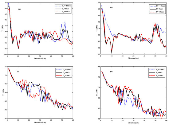 To accurately analyze the changes in TL affected by the eddy, TLs at four receiver depths (150 m, 250 m, 2700 m, and 3100 m) are presented in Figure 5. The differences of energy distribution in the eddy are quantitatively described through comparison. (1) Within the first CZ, the TL in the warm eddy at a depth of 150 m is approximately 5 dB higher than that in the no-eddy environment, while the TL in the cold eddy is slightly reduced. (2) As shown in Figure 5b, at a receiver depth of 250 m, the cold eddy reduces TL by 10 dB in the ranges of 0–10 km and 50–60 km, while no similar phenomenon is observed under the influence of the warm eddy. (3) In Figure 5c, at a receiver depth of 2700 m, the TL increases by about 6 dB at a distance of 25 km in the warm eddy, whereas the energy changes little in the cold eddy. However, at the same distance, the change in TL at the receiver depth of 3100 m in Figure 5d is different. The TL is slightly reduced in the presence of a warm eddy, while it is increased in the cold eddy.