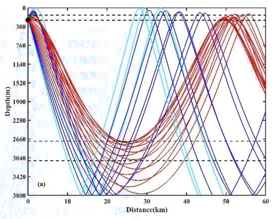 To explain the differences in TL caused by the eddy in Figure 4 and Figure 5, ray diagrams in the different environments are given in Figure 6, where the black dot represents the sound source located at a depth of 250 m. The red rays indicate the water-refracted paths without bottom bounce. The blue rays indicate the bottom-bounce paths. The cyan rays represent surface-bottom-bounce paths. The black horizontal lines represent different receiver depths, including 150 m, 250 m, 2700 m, and 3100 m. As depicted in Figure 6b, when the receiver depth is 150 m, the presence of a warm eddy increases the sound speed in the upper layer. As a result, the turning points in the CZ deepen, and the refracted paths cannot reach the receiver depth, thus leading to an increase in TL. Conversely, in Figure 6c, the cold eddy reduces the upper sound speed, allowing more refracted paths to reach the receiver depth. As a result, the turning points in the CZ become shallower, leading to a reduction in TL. At a receiver depth of 250 m, there is an eddy waveguide with lower sound speed in Figure 6c. The small-angle launch rays are deflected towards the depth of the cold-eddy waveguide (150 m) within the initial 10 km. This deflection causes a part of the refracted paths propagating in this region. However, the thickness of the waveguide is thin and gradually decreases with distance from the eddy, causing rays to leak from the waveguide after propagating with a certain distance. Furthermore, the TL is small within a distance of 0 to 10 km. The refracted paths affected by the waveguide converge near the first CZ, leading to a uniform ray distribution and an expanded convergence area. As shown in Figure 6b and c, the presence of a warm or cold eddy changes the sound speed at the source, causing the depth of refracted paths to be deeper or shallower, respectively, in the direct sound region. In Figure 6b, at a receiver depth of 2700 m, the refracted paths fail to reach the receiver within the range of 20 to 30 km in the warm eddy, resulting in an increase in TL in this region. At a receiver depth of 3100 m, the deepening of turning points in the warm eddy leads to a concentration of refracted paths, thereby diminishing TL at this depth. Due to different launch angles, the turning-point depths of refracted paths change differently in the cold-eddy environment, as shown in Figure 6c. This variation results in fewer rays within a distance of 20 to 30 km, thus increasing TL at this receiver depth. In summary, the presence of an eddy changes the sound speed at the source location and sound speed horizontal distribution, which ultimately impacts the overall sound field distribution.