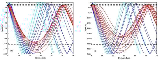 Ray traces for the environments with or without an eddy; (a) no eddy ( = 0 m/s), (b) a warm eddy ( = 10 m/s), and (c) a cold eddy ( = −10 m/s).