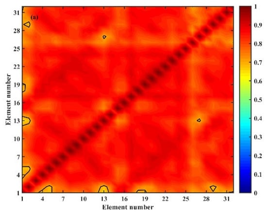 The vertical array is placed in the first shadow zone near the sea surface, approximately 25 km away from sound source. In this region, there is no direct path, and only the bottom-bounce paths are received. Figure 15 shows the vertical correlation coefficient in the first shadow zone under the environments with or without an eddy. It can be observed from Figure 7 and Figure 15 that the vertical correlation coefficient in the first shadow zone remains relatively stable regardless of element positions. This observation suggests that the existence of an eddy has little impact on the vertical correlation in this region. The main contribution to the sound field in the first shadow zone are the bottom-bounce paths. As a result of these complex multipath interference patterns, the received signal pulse of each element is relatively complex. Therefore, the vertical correlation in this region is generally low. Moreover, this area is characterized by rays with large launch angles, which have more interaction with the bottom and are less affected by sound speed disturbance. Therefore, the received signals have little impact from the eddy, and changes in the vertical correlation are not obvious. In practice, the SNR of received signals in the shadow zone is lower compared to the direct sound region and the first CZ. Hence, the corresponding vertical correlation in the shadow zone will further decline due to the lower SNR.
