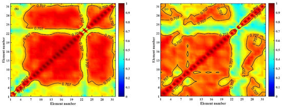 where and represent the angular frequency and bandwidth of the received signal, respectively. represents the spectrum of the received signal. * denotes complex conjugation. represents the real part of the calculation result. The threshold for the correlation coefficient is set as , and the vertical correlation radius is defined as the array spacing when the vertical correlation coefficient drops to 0.707.