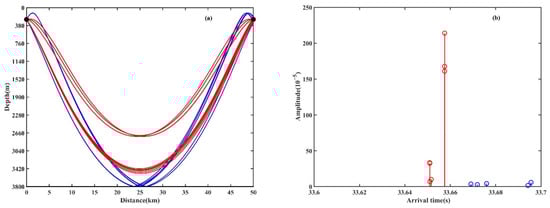 Eigenrays and time arrivals at the depth of 250 m in the first convergence zone for the environments with or without an eddy; (a) the eigenrays without an eddy ( = 0 m/s), (b) the time arrivals without an eddy ( = 0 m/s), (c) the eigenrays with a warm eddy ( = 10 m/s), (d) the time arrivals with a warm eddy ( = 10 m/s), (e) the eigenrays with a cold eddy ( = −10 m/s), and (f) the time arrivals with a cold eddy ( = −10 m/s). The red and blue colors indicate the water-refracted path without bottom bounce and the bottom-bounce path, respectively.
