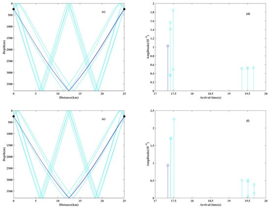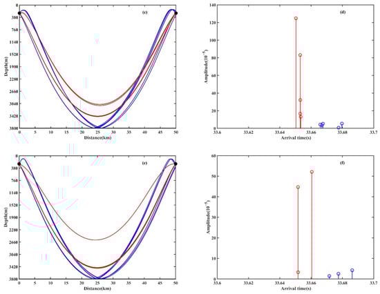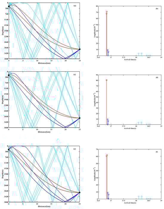 Eigenrays and time arrivals at the depth of 250 m in the first shadow zone for the environments with or without an eddy; (a) the eigenrays without an eddy ( = 0 m/s), (b) the time arrivals without an eddy ( = 0 m/s), (c) the eigenrays with a warm eddy ( = 10 m/s), (d) the time arrivals with a warm eddy ( = 10 m/s), (e) the eigenrays with a cold eddy ( = −10 m/s), and (f) the time arrivals with a cold eddy ( = −10 m/s). The blue and cyan colors indicate the bottom-bounce path and surface-bottom-bounce path, re-spectively.