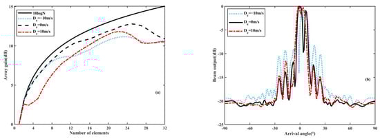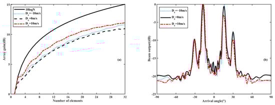 where and represent the output SNR of an array and a single array element, respectively. and , respectively, denote the output signal power after array processing and the signal power of a single array element, while and , respectively, represent the output noise power after array processing and the noise power of a single array element. For the sake of maintaining generality, the array gain is obtained by CBF. The conventional beamformer is based on the planewave model whose weighting coefficient can be written as: