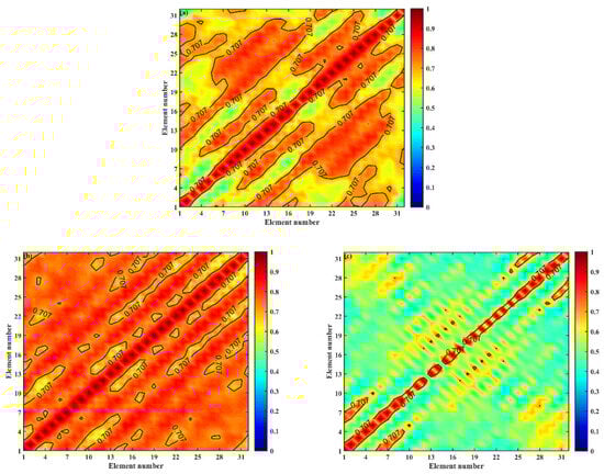 Vertical correlation coefficient in the direct sound region for the environments with or without an eddy; (a) no eddy ( = 0 m/s), (b) a warm eddy ( = 10 m/s), and (c) a cold eddy ( = −10 m/s). The values on the diagonal are equal to 1.