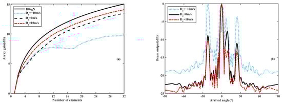 The array gain and beam output in the first CZ for environments with or without an eddy are shown in Figure 10, with the theoretical limit of the array gain . It can be seen that the arrival angle is near 0°, corresponding to the refracted paths turned in this region. With the increase in the number of elements, the array gain in this region increases first and then decreases. Additionally, the array gain in the absence of an eddy exceeds that in eddy environments. Specifically, when the number of elements is small (n < 5), the array gain in a warm eddy is smaller than that in other environments. However, as the element number increases, the array gain increases rapidly in the warm eddy. Combined with Figure 7 and Figure 8, it is evident that for small element numbers (n < 5), the array elements are located outside the first CZ, resulting in a decrease in vertical correlation and array gain. Nonetheless, with an increase in array elements, some array elements are located in the first CZ, leading to a continuous improvement in vertical correlation and array gain in the warm eddy. Similarly, there is a corresponding relationship between vertical correlation and array gain in the cold eddy. When the number of array elements exceeds a certain threshold, some elements of the vertical array are outside the first CZ, leading to a decrease in vertical correlation and array gain. Ultimately, when n = 32, the differences in beam output and array gain among various environments become small.