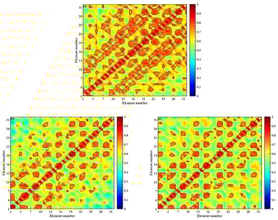 The vertical array is placed at a large depth of 25 km from the sound source in the direct sound region. The main rays are refracted without bottom bounce in this area, resulting in a large amount of sound energy. The vertical correlation with or without an eddy in the direct sound region is shown in Figure 12. As observed in Figure 7 and Figure 12, when there is no eddy ( = 0 m/s), each element is located at the second interference beam in the direct sound region (Figure 7a), leading to a good vertical correlation, while the correlation coefficient diminishes as the elements move away from the center. In the presence of a warm eddy ( = 10 m/s), the entire vertical correlation is high. This can be attributed to the warm eddy that deepens the turning points in the direct sound region, thereby placing the entire vertical array within the first interference beam (Figure 7b). On the other hand, the existence of a cold eddy ( = −10 m/s) results in a rapid decrease in vertical correlation. This decline occurs due to the presence of a cold eddy, as illustrated in Figure 7c, causing the turning points to be shallow. Consequently, the elements are located outside the interference beam, consistent with the change in TL in Figure 5d.