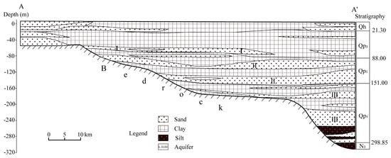 Hydrogeological cross-section of line A–A’ (principal strata of the underlying aquifer system in the HJH Plain).