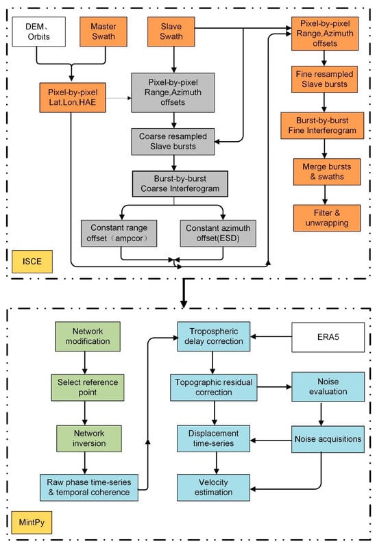 We employed the Stripmap Stack Processor of the InSAR Scientific Computing Environment (ISCE) 2.0 software for SBAS-InSAR interferogram processing []. The workflow is illustrated in Figure 3. First, the pulse overlaps of all slave acquisitions were extracted, and the geometric offsets between the slave burst overlaps and the stack master burst overlaps were roughly estimated. Then, the slave burst overlaps were resampled to the stack master burst overlaps, completing the coarse co-registration and generating differential overlap interferograms. Next, the Enhanced Spectral Diversity method (ESD) [] was used to estimate the azimuth misregistration time series of all slave acquisitions relative to the stack master, and the range misregistration time series was estimated using amplitude correlation. The time series is a least-squares estimation derived from the pair misregistration from the previous step. Finally, by combining precise orbital data and external DEM, the geometric offsets between all slave SLCs and the stack master were calculated, and all bursts were merged to complete the fine co-registration of each burst SLC. Notably, In the temporal domain, each SAR image was paired with its three nearest neighboring images, resulting in 408 pairs of interferograms. Recognizing the trade-off between resolution and coherence in large-scale monitoring, we applied a multi-look processing with parameters of 9 in the azimuth direction and 27 in the range direction for each interferogram. Additionally, a Goldstein filter with an intensity threshold of 0.5 was used to filter the phase, and the Minimum Cost Flow (MCF) method was employed for phase unwrapping of interferograms [].