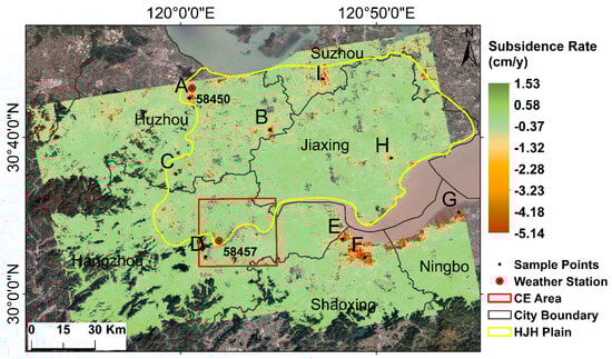 Line−of−sight (LOS) deformation rate of HJH plain and surrounding cities. Here, positive LOS velocities (in green) denote movement towards the satellite (e.g., uplift), while negative LOS velocities (in red) signify movement away from the satellite (e.g., subsidence). The red box is the Control Experimental Area (CE Area) of the two InSAR technology comparison experiments. A–I represent sample points located in key land subsidence areas. The two points with values 58,450 and 58,457 are weather stations and are used for the Section 5 in Section 5.1.3.