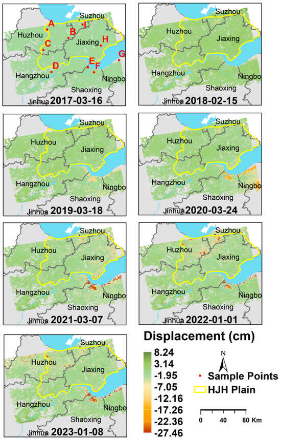 Figure 5 presents the time-series information of cumulative surface land subsidence in the HJH Plain and surrounding cities from 26 March 2017 to 20 January 2023. Using the Sentinel-1A TOPS SAR image acquired on 16 March 2017, as the reference time for this time series, cumulative deformation values are recorded approximately once a year. Throughout this period, we observe a continual expansion of the overall area experiencing land subsidence deformation in the HJH Plain and surrounding cities, accompanied by a deepening trend in the degree of land subsidence deformation. However, there are also instances of slowdown and uplift of land subsidence deformation in certain areas, such as in the eastern part of Jiaxing city during 2021–2022 and in the eastern part of Huzhou city during 2022–2023.