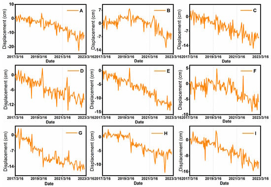 Time−series deformation curve of each settlement sampling point. (A−I) represent sample points located in key land subsidence areas.