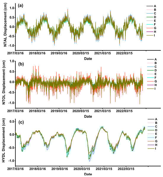 Time−series deformation of surface mass loading at deformation sampling points in each key land subsidence area. A−I represent sample points located in key land subsidence areas. A positive displacement represents vertical upward uplift deformation, and a negative displacement represents vertical downward land subsidence deformation. (a) Non−tidal atmospheric loading deformation, (b) non−tidal ocean loading deformation, (c) hydrological loading deformation. The time resolution of non−tidal atmospheric load deformation and non-tidal ocean deformation data is 3 h, and the time resolution of hydrological load deformation data is 24 h.