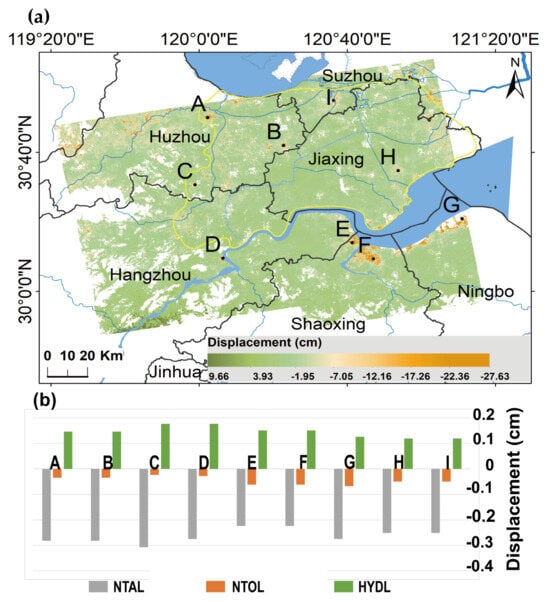 Cumulative surface deformation of the HJH Plain and surrounding cities from 16 March 2017 to 20 January 2023. A−I represent sample points located in key land subsidence areas. (a) Surface deformation monitored by SBAS-InSAR; (b) deformation caused by changes in surface mass loading.