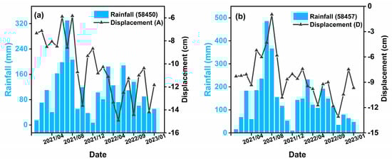 The short-term, dramatic uplift and land subsidence phenomena observed in the time-series deformation (Figure 6) exhibit clear seasonal variations, likely associated with extreme weather conditions and precipitation patterns. To investigate this correlation, we selected two land subsidence observation points, A and D, with prominent seasonal characteristics, and plotted the deformation from January 2021 to January 2023 (deformation data missing for July 2022) in relation to monthly precipitation data obtained from nearby weather stations 58,450 and 58,457 (Figure 4).