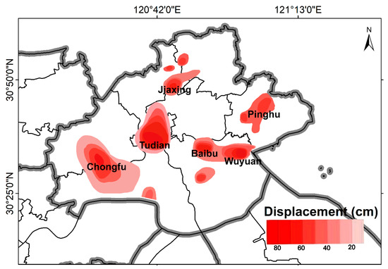 Distribution map of surface land subsidence funnels in Jiaxing City (1964–2018) (reference []).