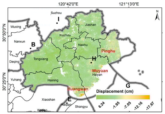 Surface land subsidence distribution in Jiaxing City from 16 March 2017 to 20 January 2023. “B,E,G,H,I” are sample points located in key land subsidence areas.