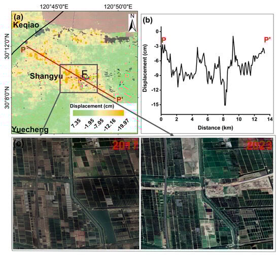 Typical land subsidence in Shangyu District, Shaoxing City. “F” is sample points located in key land subsidence areas. (a) Cumulative land subsidence from 16 March 2017 to 20 January 2023; (b) subsidence profile along PP’; (c) Google Earth images of the selected area in 2017 and 2023.