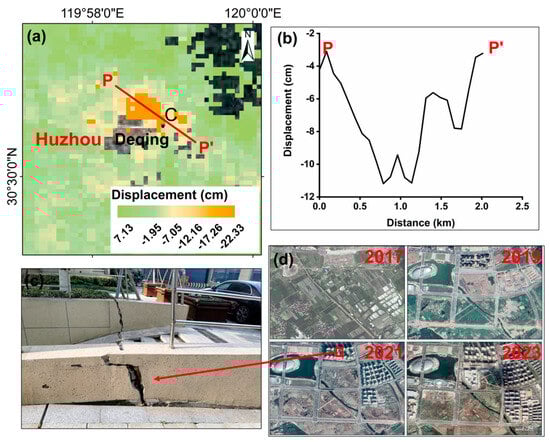 Typical land subsidence in Deqing County, Huzhou. “C” is sample points located in key land subsidence areas. (a) Cumulative land subsidence from 16 March 2017 to 20 January 2023; (b) subsidence profile along PP’; (c) cracks that have appeared in residential areas; (d) Google Earth images of the selected area in 2017–2023.