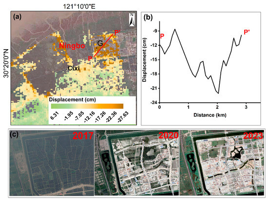 Typical land subsidence in Cixi City, Hangzhou. “G” is sample points located in key land subsidence areas. (a) cumulative land subsidence from 16 March 2017 to 20 January 2023; (b) subsidence profile along PP’; (c) Google Earth images of the selected area in 2017–2023.