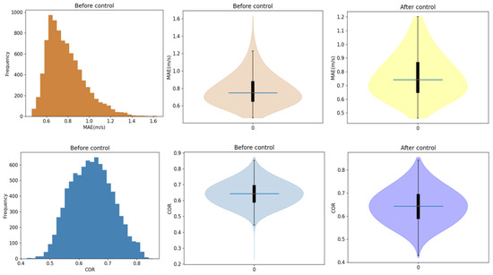 The first column displays statistical histograms for Mean Absolute Error (MAE) and Correlation (COR) of regional site data; the second column shows the violin plots of MAE and COR for regional site data before data cleansing; the third column presents the violin plots of MAE and COR for regional site data after data cleansing.