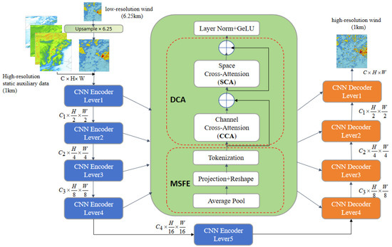 However, the traditional UNET architecture has some drawbacks: Firstly, the local nature of convolutions fails to capture long-range dependencies between different features; secondly, simple skip connections between encoder and decoder features can cause semantic gaps. Inspired by research in the field of medical image segmentation [24,25,26], we propose a deep learning model for spatial downscaling of wind fields in the China Meteorological Administration Land Assimilation System (CLDAS) based on the UNET architecture, called UNET_DCA, incorporating a Dual Cross-Attention (DCA) mechanism. This model, based on the UNET architecture, introduces a Dual Cross-Attention module (DCA) that sequentially captures channel and spatial dependencies between multi-scale encoder features to address the semantic gap between encoder and decoder features. By adaptively focusing on channels and spatial features, it facilitates information exchange and interaction between different positions, aiding the model in better understanding global context information and alleviating information loss issues caused by spatial downscaling. The overall model structure, as shown in Figure 3, mainly includes the UNET basic architecture, the Multi-Scale Feature Embedding Module (MSFEM), and the Dual Cross-Attention (DCA) mechanism module, with each module detailed in subsequent sections.