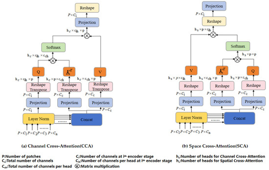 The Spatial Cross-Attention module (SCA) is shown in Figure 4b. The output of the Channel Cross-Attention module is taken as the input of SCA, and the input is first normalized along the channel dimension. A 1 × 1 deep convolution projection is then performed to generate queries, keys, and values, as follows: