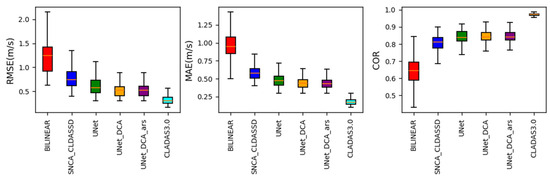 Figure 5 presents box plots of wind speed RMSE, MAE, and COR metrics calculated using station data as the Ground Truth for the downscaling results of each method. It can be concluded that UNET_DCA also exhibits the best performance, with lower dispersion of each metric around the mean compared to other downscaling methods.