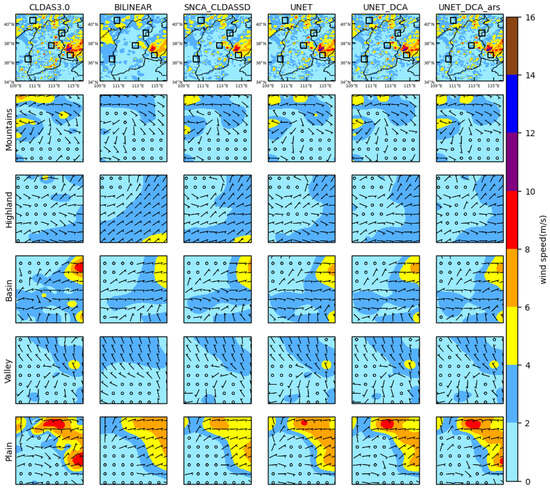 Figure 6 shows the visual comparison of the downscaling results of various methods at 12:00 UTC on 24 April 2019. The first row displays the overall effects of CLDAS3.0 and each method in the study area, followed by images representing local regions of five different terrains, i.e., mountainous, plateau, basin, valley, and plain. From the visual comparison of the images, it can be observed that the downscaled results of the traditional bilinear interpolation method simply increase the grid resolution without effectively reconstructing the corresponding details, whereas deep learning models, by incorporating auxiliary information, can better reconstruct the spatial details of the wind field. Under the same auxiliary information conditions, UNET and UNET_DCA based on the UNET architecture outperform SNCA_CLDASSD in capturing more realistic spatial details. Among them, UNET_DCA_ars, which incorporates more auxiliary information, performs the best and is more similar to the truth in CLDAS3.0.
