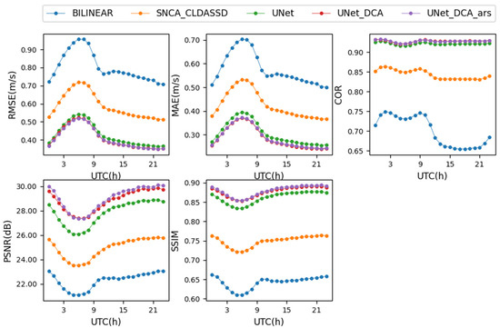 Figure 7 illustrates the diurnal variations in wind speed RMSE, BIAS, MAE, COR, PSNR, and SSIM for various downscaling methods calculated using CLDAS3.0 as the Ground Truth. Overall, all methods exhibit similar trends in these metrics over time. During periods when bilinear interpolation performs poorly, all deep learning models also perform poorly. In terms of RMSE, BIAS, MAE, PSNR, and SSIM metrics, both bilinear interpolation and all models perform worse during the day and better at night. This is because, overall, the wind field variability during the day is greater than at night, leading to lower data quality for daytime wind field data. As previously mentioned, better data quality leads to better downscaling results. However, in the case of the COR metric, bilinear interpolation performs better during the day than at night, while the deep learning models perform equally well during both day and night. This indicates that deep learning models, due to their deep learning structure and feature extraction capabilities, are able to learn and capture more spatiotemporal patterns and complex relationships. Whether it is daytime or nighttime, they demonstrate greater robustness in handling nonlinear and variable wind speed distributions. Overall, SNCA_CLDASSD consistently outperforms bilinear interpolation at all times, with UNET showing superior performance over SNCA_CLDASSD and UNET_DCA slightly outperforming UNET. UNET_DCA and UNET_DCA_ars perform similarly, with the latter slightly edging ahead.