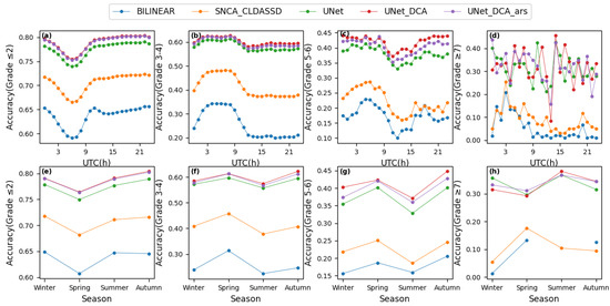 The second row of Figure 9 presents the seasonal variations in wind speed grade accuracy for various downscaling methods calculated using CLDAS3.0 as the Ground Truth. For wind speeds equal to or less than grade 2 (Figure 9e), the accuracy is lowest in spring and highest in autumn. Regarding wind speeds of grades 3 to 4 and 5 to 6 (Figure 9f,g), accuracy is poorest in summer and best in spring. For wind speeds equal to or greater than grade 7 (Figure 9h), bilinear interpolation and SNCA_CLDASSD exhibit the lowest accuracy in spring and winter, with the highest accuracy in spring, while the other three UNET architecture models perform the worst in spring and the best in summer.