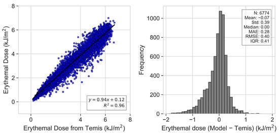 Scatter plot between the daily erythemal UV doses from the model and TEMIS (left panel) for Athalassa during the period 2004–2023. Distribution of the absolute differences between daily erythemal doses from the model and TEMIS (right panel).