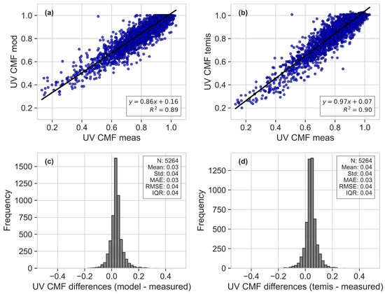 Scatter plot between (a) the daily erythemal UV CMF from the model and the ground-based measurements, (b) the daily erythemal UV CMF from TEMIS and the ground-based measurements. Distribution of the absolute differences between (c) the erythemal UV CMF from the model and measurements and (d) TEMIS and measurements. The comparisons are for Athalassa station and encompass the period 2004–2021.