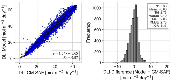 Figure 3 provides a comparison of the DLI obtained from a model against the DLI from the CM-SAF SARAH-3 dataset. The strong linear relationship in the scatter plot is evidenced by a high coefficient of determination (R2 = 0.97), indicating excellent agreement between the two datasets. The histogram on the right details the distribution of differences between the model’s DLI and CM-SAF’s DLI, centered very close to zero with a mean of −0.06 mol m−2 day−1, suggesting a negligible systematic bias. The spread of the differences, reflected in the standard deviation of 2.73 mol m−2 day−1, and interquartile range (IQR) of 3.33 mol m−2 day−1, indicate the variability in the data comparison.