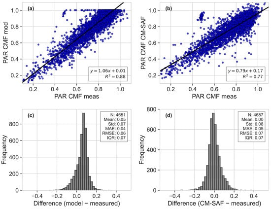 Scatter plot between (a) the daily PAR CMF from the model and the ground-based measurements, (b) the daily PAR CMF from CM-SAF and the ground-based measurements. Distribution of the absolute differences between (c) the PAR CMF from the model and measurements and (d) the CM-SAF and measurements. The comparisons are for Athalassa station and encompass the period 2004–2021.