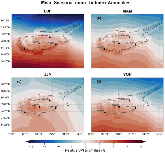 Relative seasonal noon UVI anomalies over Cyprus for (a) winter, (b) spring, (c) summer and (d) autumn.