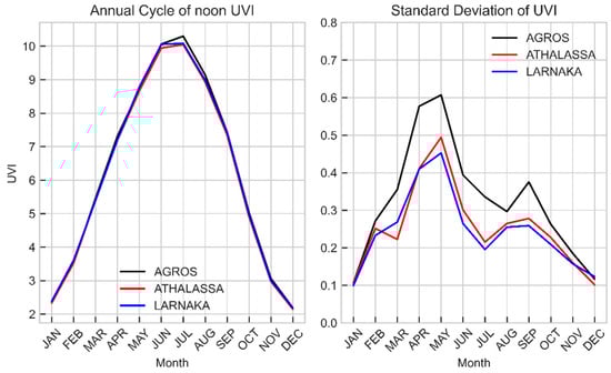 Monthly average noon UVI for the period 2004–2023 for Agros, Athalassa, and Larnaka (left panel), and the corresponding standard deviation (right panel).