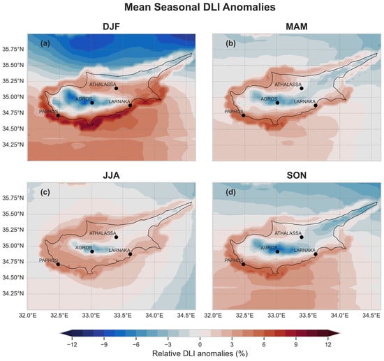 Relative seasonal DLI anomalies over Cyprus for (a) winter, (b) spring, (c) summer and (d) autumn.
