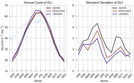 Contrary to the UV outcomes, we observe that the DLI is generally lower over Agros, a higher-altitude site, compared to the two lower-altitude locations (Larnaka and Athalassa) (Figure 8). As explained above, this is mainly due to the prevalence of clouds, which have a more pronounced effect on the DLI than the effect of altitude. The DLI at Agros ranges from 20 mol m−2 day−1 in the cloudier months of December and January to ~65 mol m−2 day−1 during the clearer skies of June and July (Figure 8). Notably, Larnaka, which is a coastal city, exhibits the highest DLI values in June, while Agros and Athalassa, being further inland, reach their peak DLIs in July. The coastal influence likely mitigates cloud cover in June at Larnaka, whereas inland areas, like Agros and Athalassa, experience a delayed peak in the DLI due to more significant cloud effects during this period. Despite higher SZAs and longer days in June, it is the reduced cloudiness in July that results in the maximum DLI observed at the inland sites.