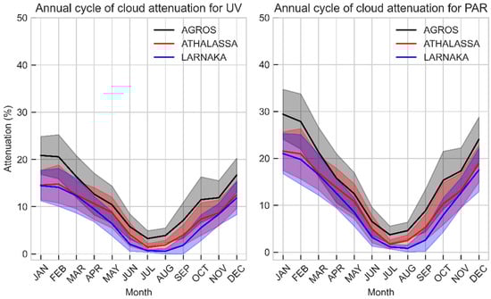 Monthly average attenuation of the daily average UVI (left) and daily PAR (right) for the period 2004–2023 for Agros, Athalassa, and Larnaka. Shaded areas represent the standard deviation range (1σ).