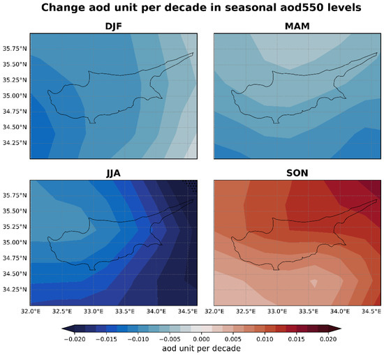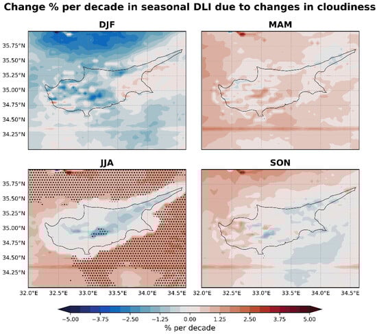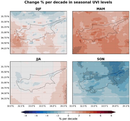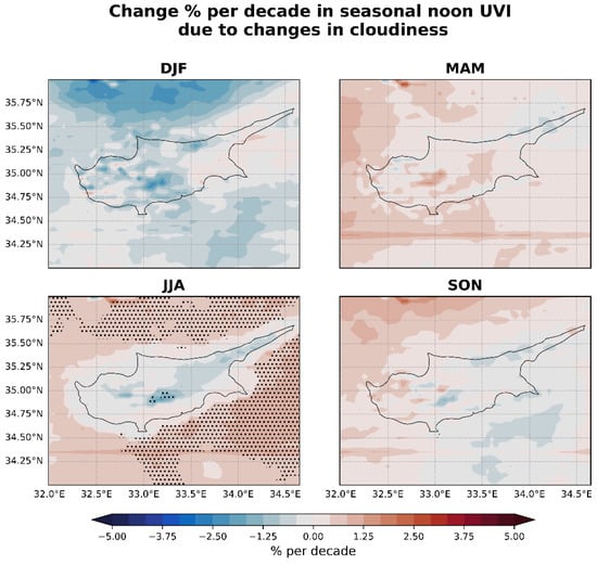 Figure 10 illustrates the seasonal trends in the noon UVI across Cyprus for the years 2004 to 2023 based on the same modeled dataset that was used for the previous climatological analysis. These trends are primarily influenced by variations in cloud cover, aerosol concentrations, and ozone levels. Analysis of the impact of cloud attenuation on the seasonal noon UVI, detailed in Figure 12, indicates a marginal yet statistically nonsignificant rise in the UVI during most seasons, except for winter (DJF). This increase becomes statistically significant in the summer (JJA) over maritime regions, while changes over terrestrial areas are minimal. It is clear that while cloud cover is influential in determining the overall direction of the noon UVI trends, still they cannot fully explain the UVI trends; thus, changes in AOD and TOC also play substantial roles in the observed variations.