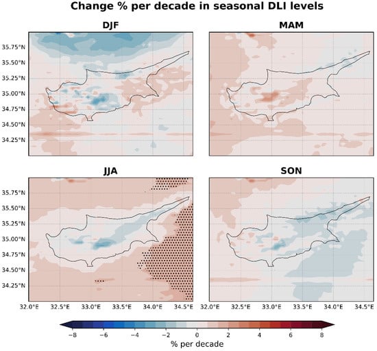Trends in the seasonal average daily DLI for the period 2004–2023. Statistically significant trends are marked with an x.