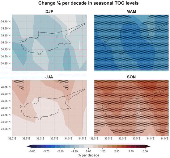 AOD trends, depicted in Figure 14, generally exhibit a downward trend across all seasons, except for autumn (SON), which shows positive trends. Nonetheless, these variations do not achieve statistical significance. On the other hand, Figure 15 reveals significant declines in TOC during winter and spring (MAM), no notable changes in summer, and significant increases in autumn. Winter reveals notable spatial variability in UVI trends, with certain areas, especially in the south and west, showing slight positive trends, in contrast to the negative trends observed in the north and northeast. Despite this spatial diversity, the trends remain statistically insignificant. The transition seasons, spring and autumn, show complex patterns. Spring is characterized by positive, though statistically insignificant, UVI trends, while autumn sees significant negative trends in the north and east of the island. This autumnal decrease is mainly attributed to significant positive TOC trends of 2–3% shown in Figure 15 and the nonsignificant positive trends in AOD depicted in Figure 14. Summer showcases a uniformity in UVI levels, indicating a stable pattern of UV exposure during these months, unaffected significantly by changes in clouds or TOC. In summary, the observed shifts in the UVI throughout the year suggest a nuanced interplay between cloud cover, aerosols, and ozone levels, with each factor contributing differently across seasons and regions. The significant seasonal and spatial variations underscore the importance of considering multiple atmospheric factors when assessing UVI trends.
