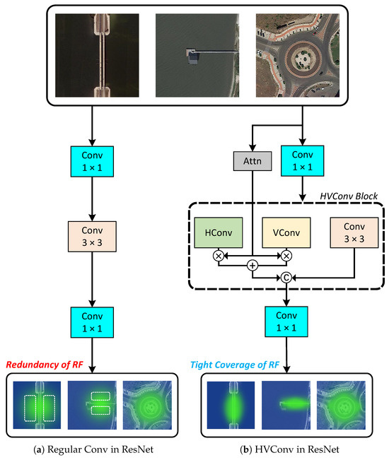 Object detection has consistently been a popular and crucial task in computer vision, aiming to achieve high accuracy in recognizing various objects within different images. There are two approaches for object detection: one-stage methods [12,13] and two-stage methods [14,15]. The Faster R-CNN [14] with Feature Pyramid Network [16] is widely used as a two-stage method in common object detection. Nevertheless, remote sensing objects are smaller, denser, and positioned at various angles [17,18]. Moreover, different from the horizontal bounding box in common detection, remote sensing detection usually uses an oriented bounding box to capture objects more tightly. Thus, with the aim of solving the angle problem, more rotated object detection detectors are proposed based on existing general methods (e.g., RetinaNet [12] or Faster R-CNN [14]). Rotated RPN [19] proposed using angles for bounding box regression, resulting in a more precise rotation of the bounding boxes to cover the objects. RoI Transformer [20] introduces RRoI Learner for learning rotated RoIs from the feature map of horizontal RoIs and RRoI Warping to extract rotation-invariant features for detection. ANet [1] mainly consists of two modules, the Feature Alignment Module (FAM) and Oriented Detection Module (ODM). By incorporating these two parts, the overall framework is enhanced to be more sensitive to rotation information. The pyramid squeeze has been adopted into ANet to improve the network’s ability to extract important information as well [21]. LSKNet [7], which is based on SKNet [22], used a larger kernel convolution to obtain the context information of objects. In accordance with context features, the accuracy of detection improved significantly. ARCNet [8] adopted adaptive rotated convolution to replace the normal convolution. It is a plug-and-play module, and the aim of it is to facilitate feature extraction of the same object across various orientations, rendering it invariant, which enhances the capability of classification. Although these methods address issues from various angles, our strategy provides a whole new perspective and is totally different from theirs. Inception Network [23] introduced replacing convolution with and convolutions to reduce computational costs and achieve even accuracy. Inspired by this work, our HVConv aims to solve the aspect ratios problem in remote sensing object detection, as this approach can reduce redundancy receptive fields and expand it in an irregular aspect ratio by using narrow and asymmetric convolution, which could improve the network’s ability to detect narrow as well as long objects.