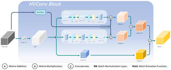 HVConv consists of HConv and VConv. The entire HVConv block is presented as shown in Figure 4. We have established these two different paths to expand the horizontal and vertical receptive fields, respectively. Given an input and the output of , the two paths of HVConv are denoted as and . We represent a 1 × 3 convolution (horizontal convolution) and a 3 × 1 convolution (vertical convolution) as and , respectively. Batch normalization is applied, using as , and represents the ReLU activation function. HConv is basically constructed by two continuous horizontal convolutions and a vertical convolution. VConv is similar to HConv, which is constructed by two continuous vertical convolutions and a horizontal convolution. A single HConv or VConv can be expressed as: