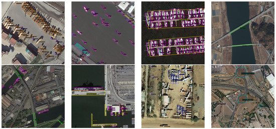 DOTA-v1.0 [11] is a large-scale dataset for object detection in aerial images, consisting of 2806 remote sensing images. It contains 188,282 instances of 15 categories: Plane (PL), Baseball diamond (BD), Bridge (BR), Ground track field (GTF), Small vehicle (SV), Large vehicle (LV), Ship (SH), Tennis court (TC), Basketball court (BC), Storage tank (ST), Soccer ball field (SBF), Roundabout (RA), Harbor (HA), Swimming pool (SP), and Helicopter (HC). Some images from the DOTA-v1.0 dataset are shown in Figure 7. The instances are in different scales and shapes.